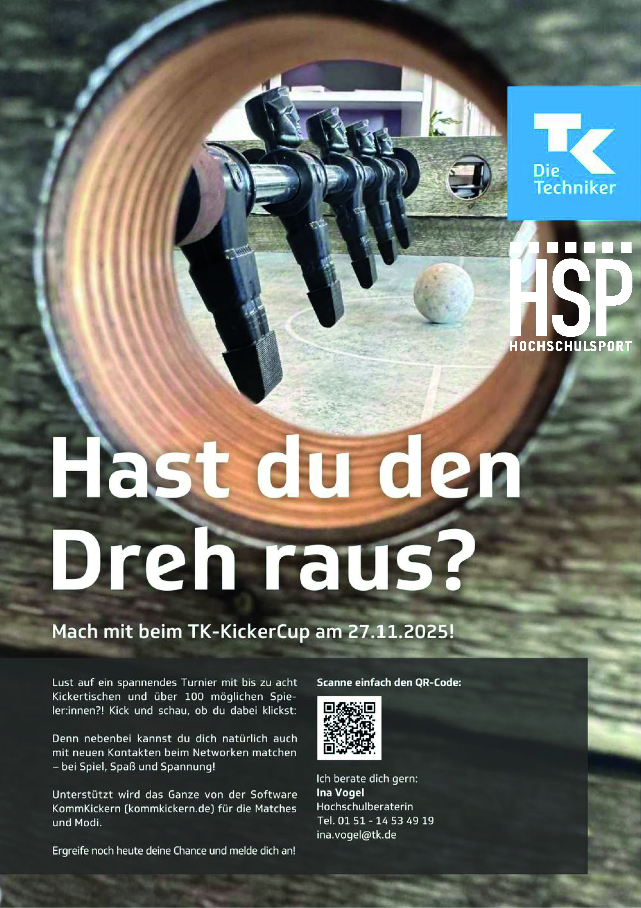 Die Techniker Krankenkasse veranstaltet in Kooperation mit dem Hochschulsport am 27.11.2025 ein Kickerturnier. Hast du Lust auf ein spannendes Turnier mit bis zu acht Kickertischen und über 100 möglichen Spieler*innen? Nebenbei kannst du natürlich mit neuen Kontakten beim Networken matchen. Das Ganze bei viel Spiel, Spaß und Spannung!