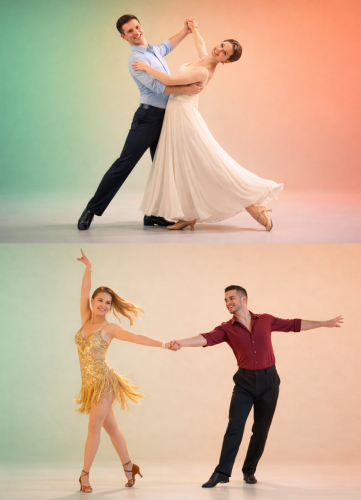 Ballroom dancing is the term used since the second half of the 20th century to describe the union of Latin American dances and standard dances. Standard dances (Slow Waltz, Tango, Viennese Waltz, Foxtrot, Slowfox and Quickstep) are movement dances in which the dancers move around the room - more or less quickly, depending on the dance. Another characteristic of the standard dances is the body contact through which the dance partners remain connected without interruption. The Latin American dances of the World Dance Program (Samba, Cha-Cha-Cha, Rumba, Paso Doble and Jive), on the other hand, are danced more stationary and largely without physical contact.
